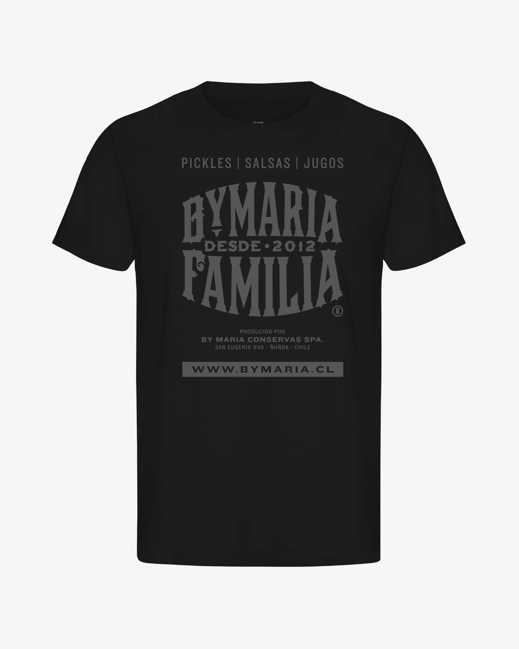 Polera en negro con serigrafía en gris oscuro. El contraste entre ambos tonos crea un acabado que destaca la simplicidad del diseño. Base sólida que se integra fácilmente en cualquier guardarropa.